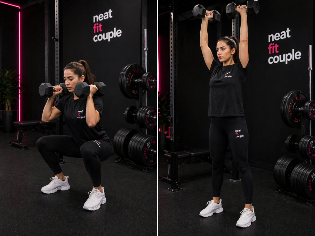 La sentadilla con press, también conocida como thruster, combina en un solo movimiento una sentadilla frontal con un press de hombros. Se parte con las mancuernas o la barra a la altura de los hombros, se desciende a la sentadilla, y al subir se aprovecha el impulso para empujar el peso por encima de la cabeza hasta extender completamente los brazos.
